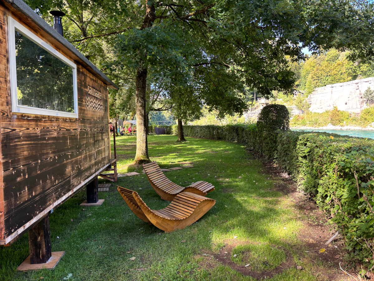 Abkühlung nach dem Saunagang bietet dir die Aare. Es hat einen schönen Strand direkt neben der Sauna. Das Bad in der Aare erfolgt auf eigenes Risiko.